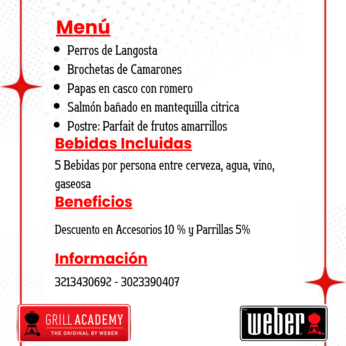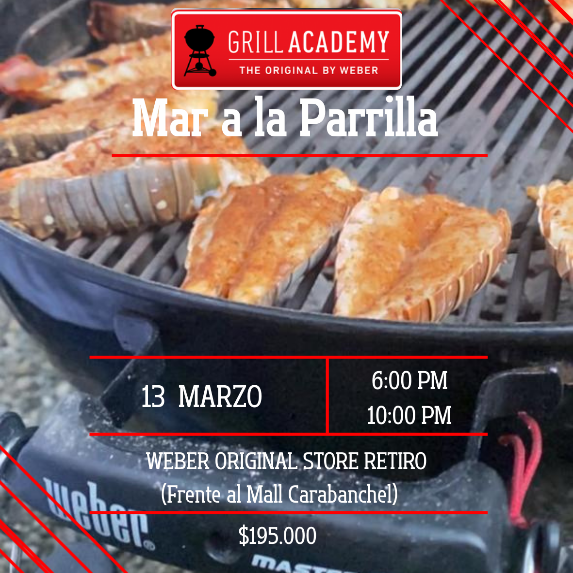 Precio habitual $195.000Participa en los famosos Grill's Academy's, un taller lleno de experiencias en las que aprenderás del mundo de los asados, productos, uso de accesorios, técnicas de cocina y muchos secretos más de la mano de los chefs parrilleros certificados por la marca Weber.