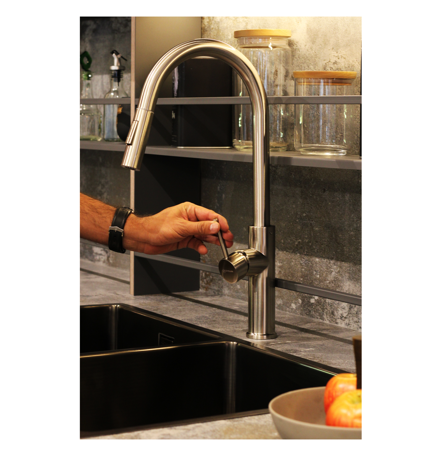 El grifo monomando de cocina Franke Icon Doccia acabado negro mate está equipado con palanca lateral, caño giratorio 360°, teleducha orientable de doble chorro y aireador laminar. Perfecto para quienes buscan un producto icónico con un estilo único que combine diseño y funcionalidad.