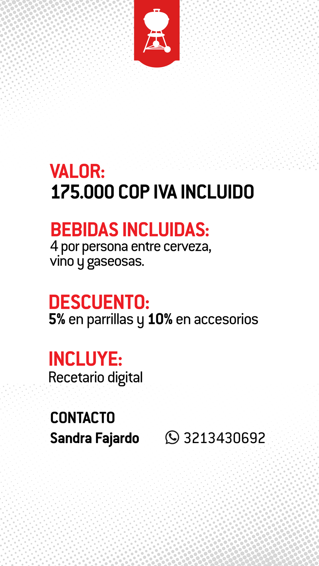 Precio habitual $175.000Participa en los famosos Grill's Academy's, un taller lleno de experiencias en las que aprenderás del mundo de los asados, productos, uso de accesorios, técnicas de cocina y muchos secretos más de la mano de los chefs parrilleros certificados por la marca Weber.