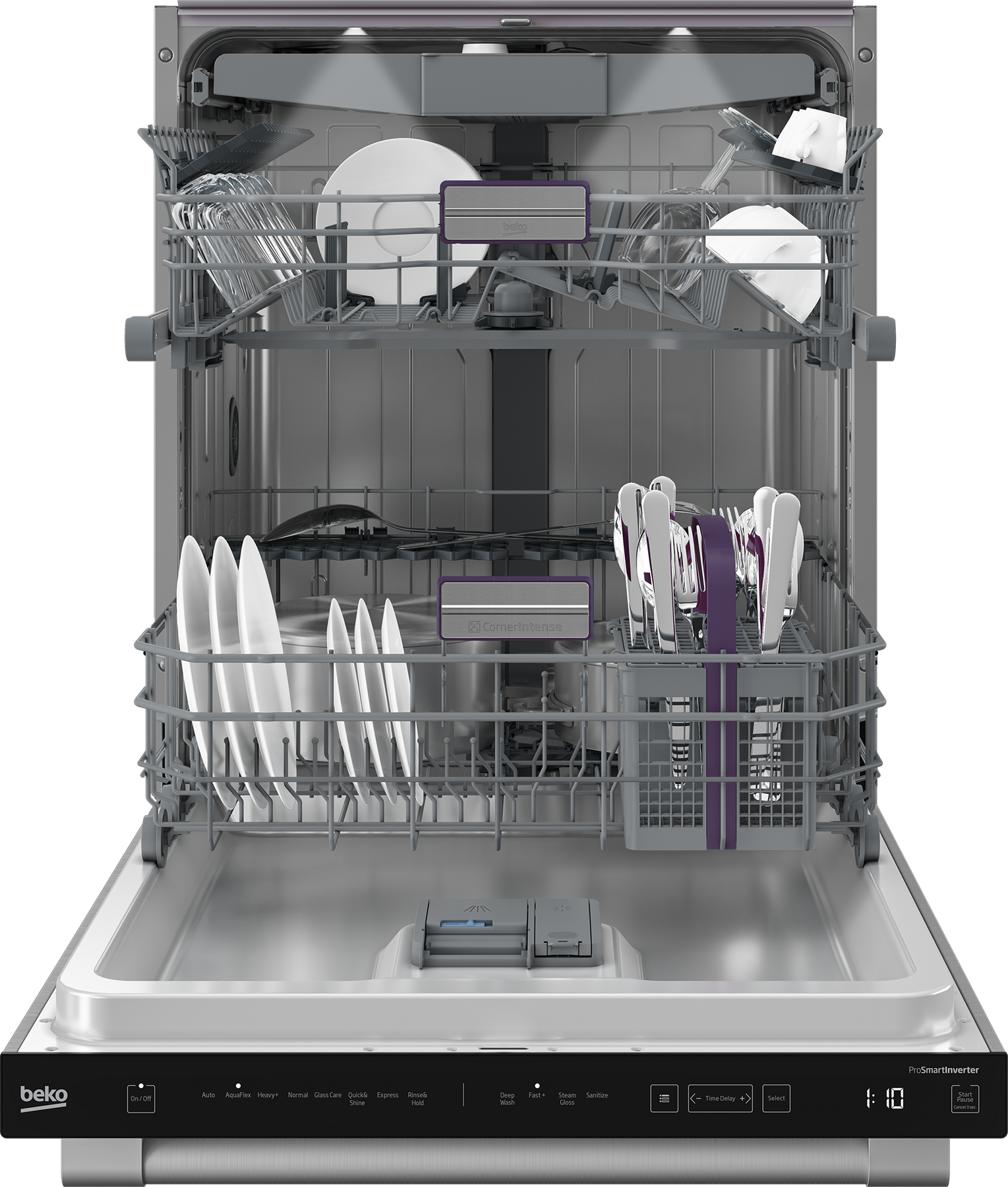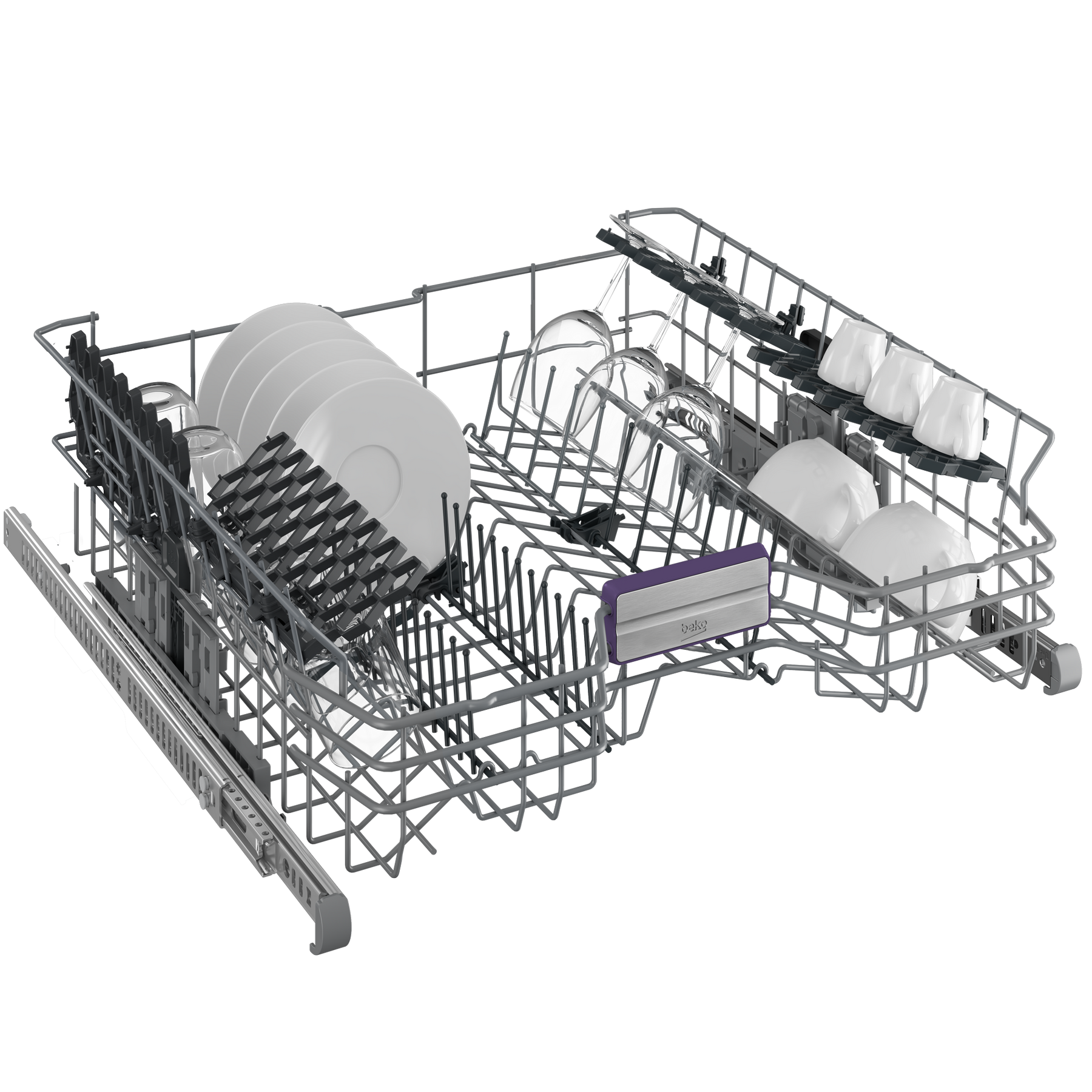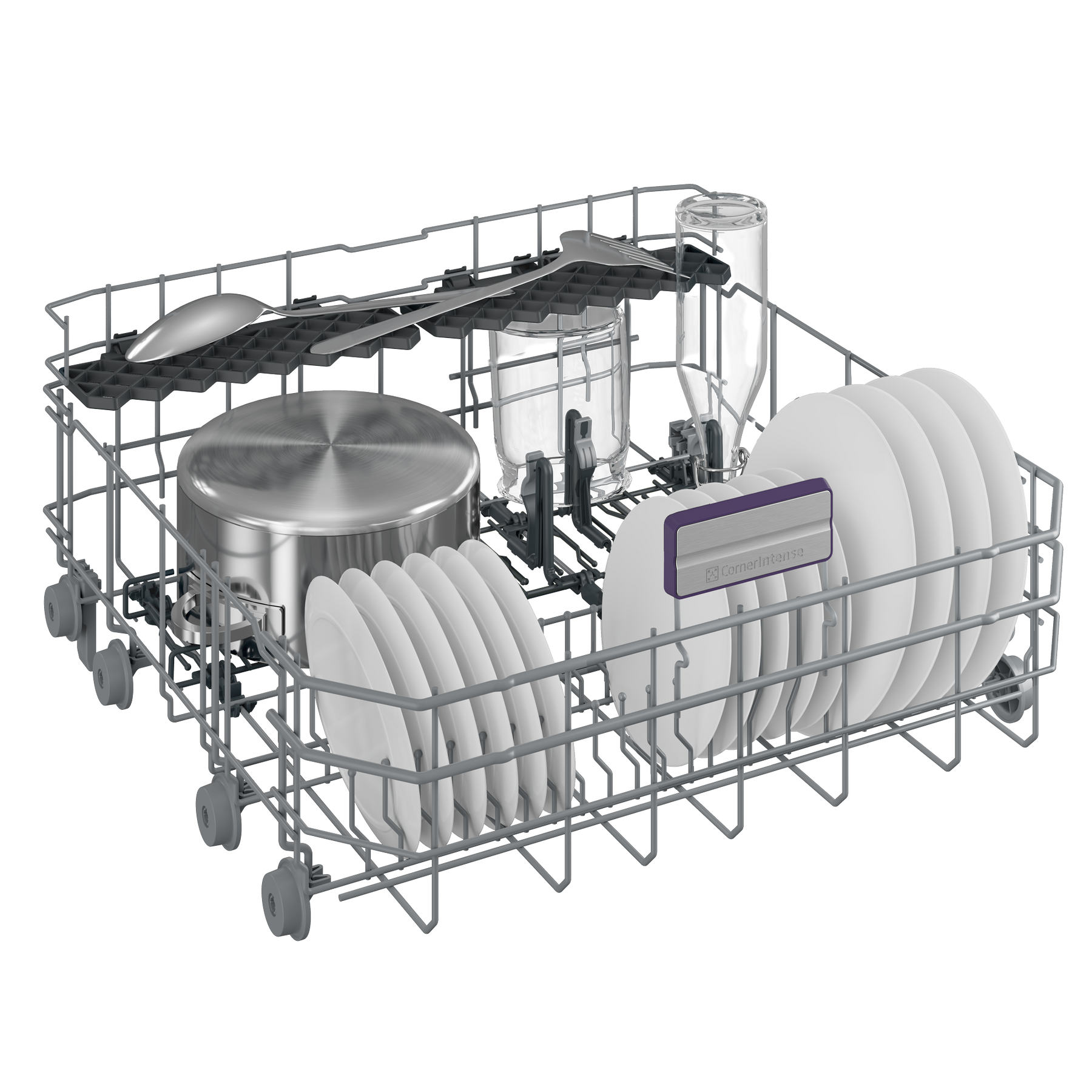 Domine el desorden de hacer con las tres rejillas de este lavavajillas de posibilidades de carga versátiles y cobertura de lavado completa. El tercer estante FreeFlex ™ se adapta a vasos, tazas, tazones, cubiertos y utensilios de cocina, lo que libera espacio debajo para ollas, platos y tazones para mezclar. El sistema avanzado de lavado con agua limpia hace circular agua limpia a los platos en las tres rejillas. La iluminación interior LED se ilumina en el interior para facilitar la carga y descarga.