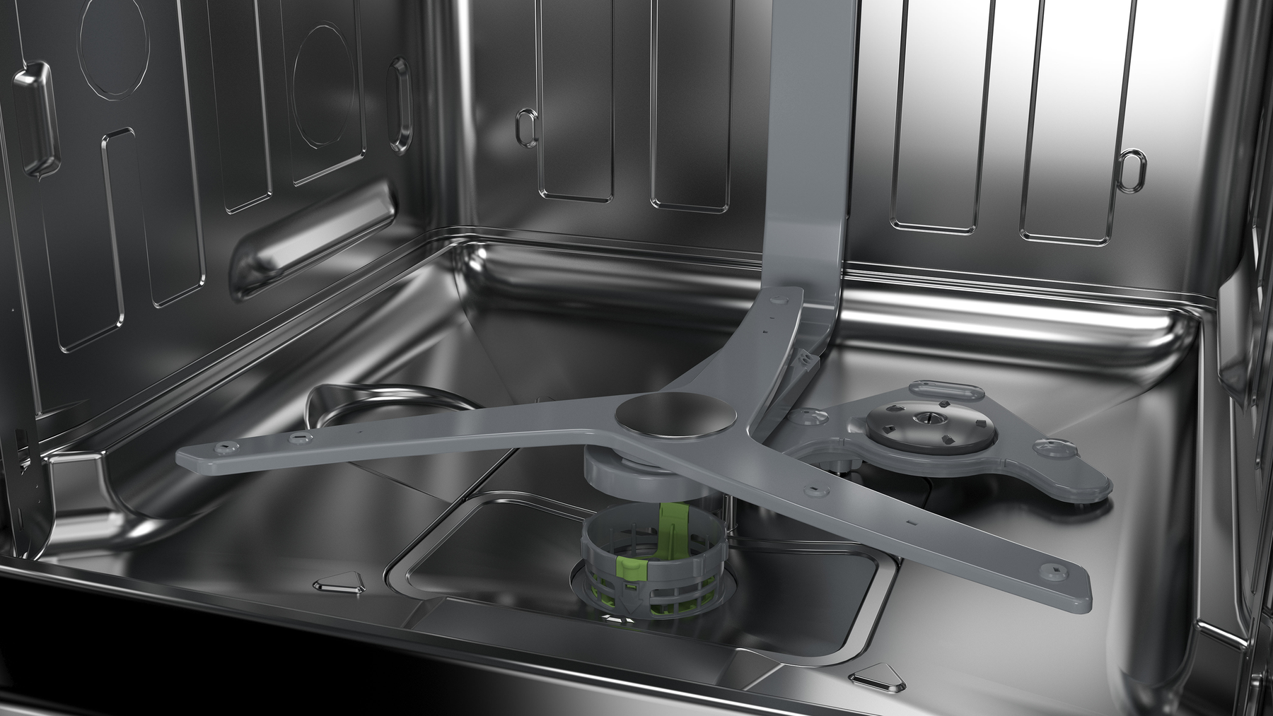 utiliza la microfiltración para eliminar continuamente las partículas de alimentos durante los ciclos de lavado y enjuague y hace circular agua limpia a los platos en las tres rejillas. Esto permite que los utensilios de cocina sucios y los utensilios de vidrio delicados se laven juntos en la misma carga.