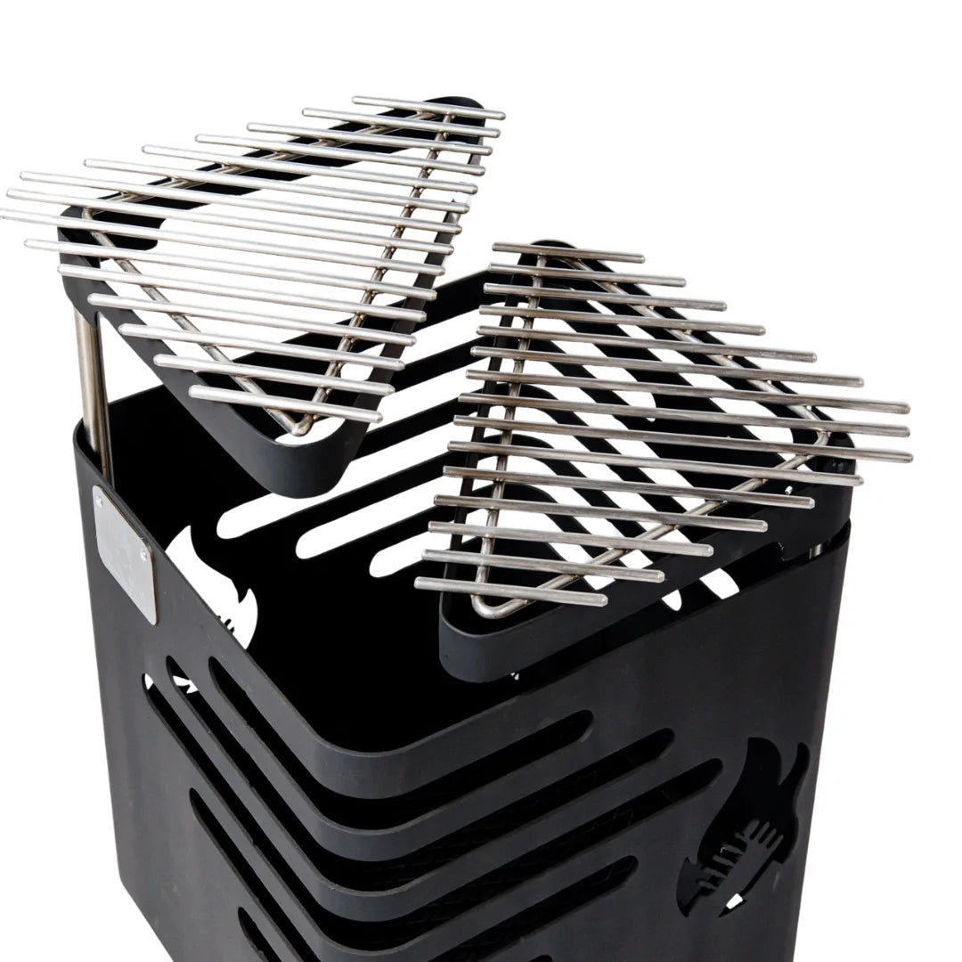 Incluye accesorios que facilitan su uso, como rejilla para asar, herramientas para el manejo de la leña y protección inferior que evita daños térmicos sobre la superficie. De esta manera, se convierte en un elemento versátil, funcional y de gran valor estético, perfecto para reuniones familiares, encuentros con amigos o momentos de relajación al aire libre.